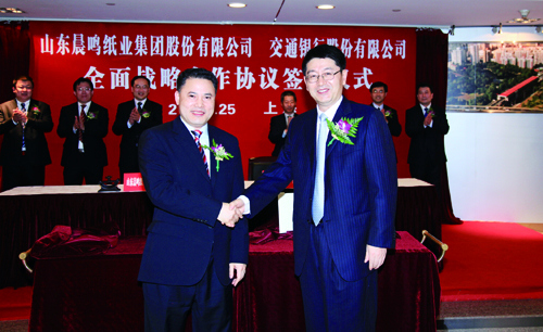 晨鳴集團董事長陳洪國在致辭中表示,交通銀行是百年銀行,是民族金融品牌的傳承者和中國銀行業改革的先行者,為中國經濟的發展提供了強有力的支持,也為晨鳴集團的發展注入了活力,是公司最重要的合作伙伴。當前,晨鳴集團計劃在山東、湖北、江西、廣東等地投資200多億元,建設一批國際尖端水平的高效節能環保項目,確保企業持續快速發展,也為與交通銀行的合作提供了更為廣闊的空間。他相信,與交通銀行進行全方位合作,一定能夠實現銀企共贏。